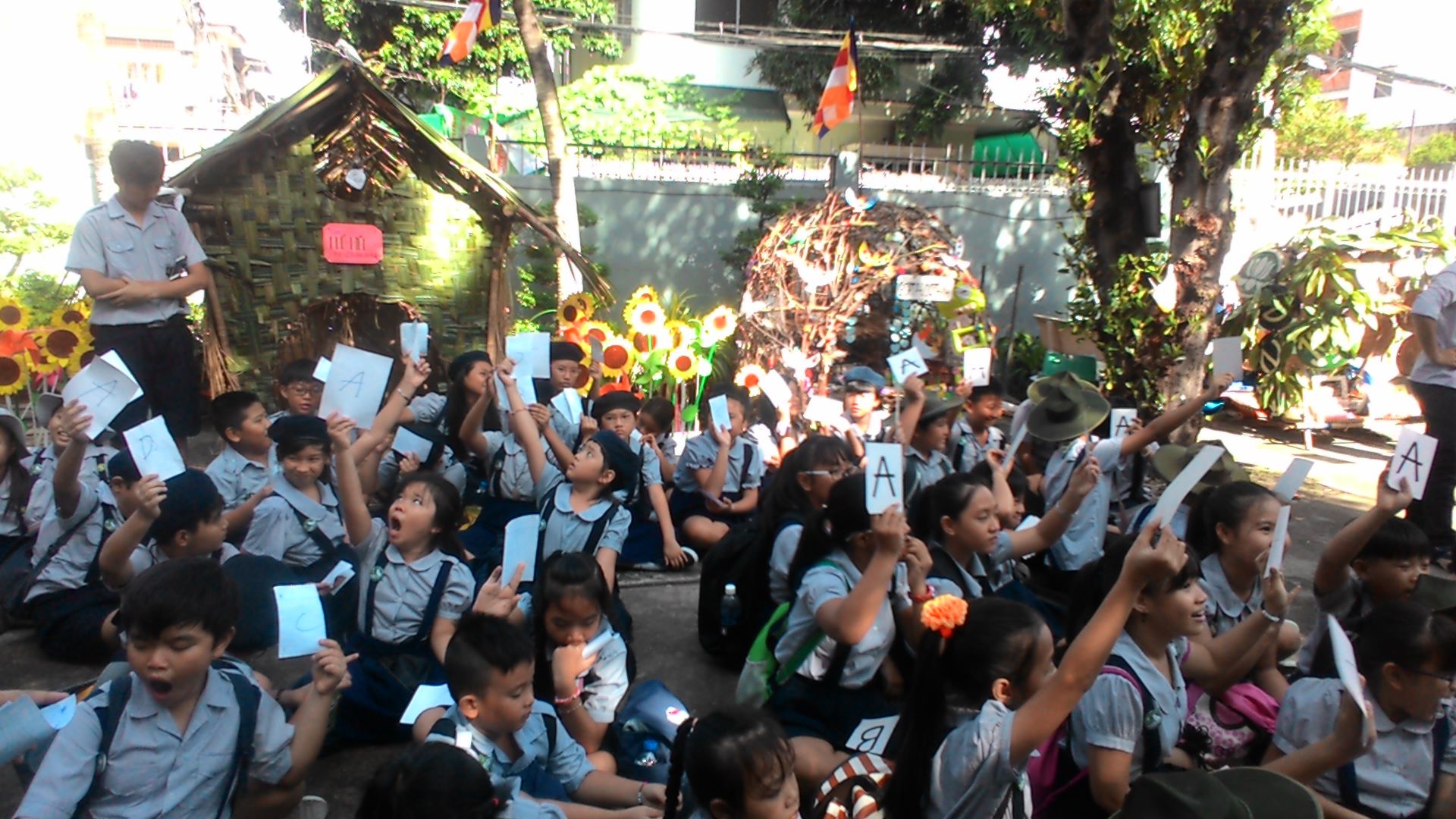 Trong khi chờ dự lễ khai mạc và cài hoa hồng, các em đã thi “ Kiến thức Phật pháp “ vòng I với cách hỏi sinh động và trả lời đáp án bằng cách chọn giơ bảng chữ cái A, B, C, D rất hào hứng.