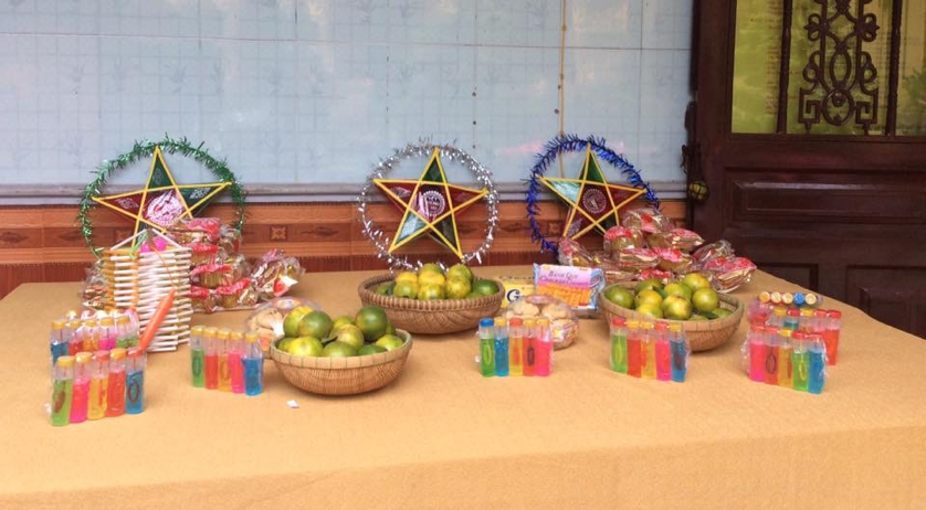 Sau khi chơi xong, tất cả mọi người được phát các tờ giấy đánh số để đi nhận món ăn. Tiếp đến, chúng em được nhận những món quà xinh xinh, đã được trưng bày trên bàn, trông thật đẹp.